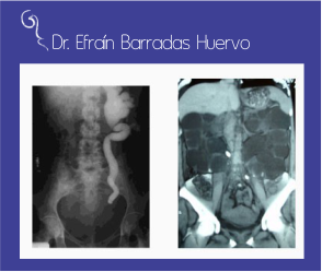 a. Urografía excretora con un cálculo en uréter b. Tomografía con ambos riñones obstruidos por dos cálculos